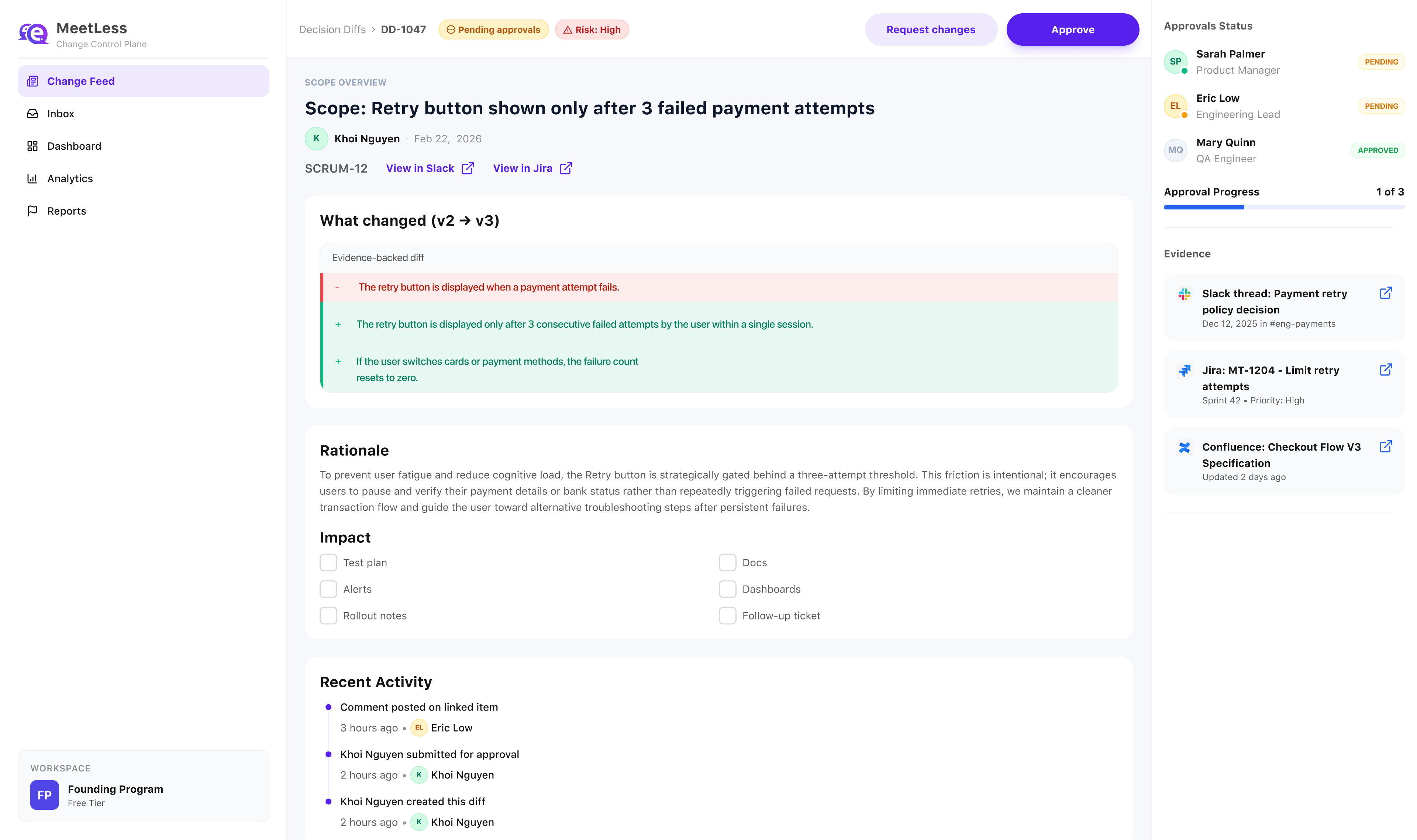 Meetless watches for scope changes, creates a Decision Diff with source citations, routes sign-off, and propagates the approved version back to every linked artifact.